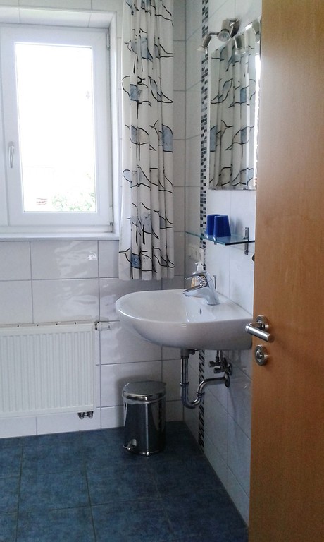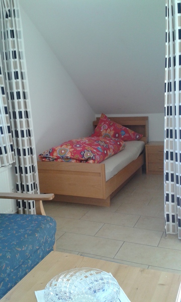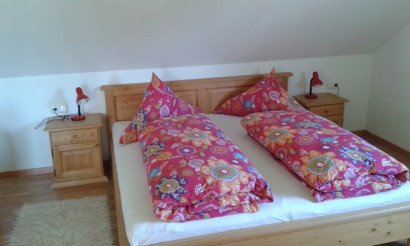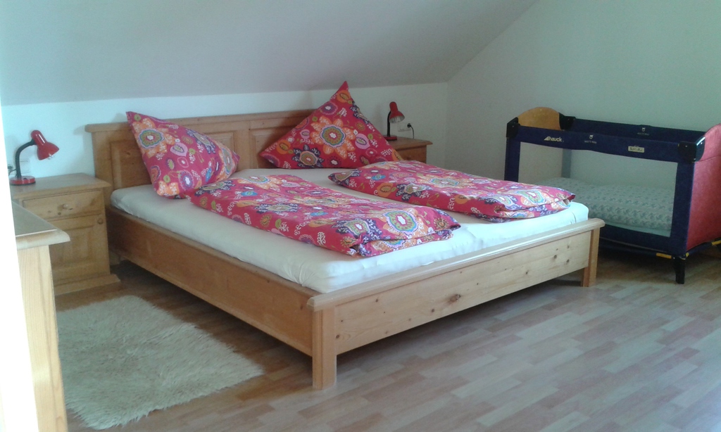 Im großen, hellen Schlafzimmer steht ein großes Doppelbett. Hell und freundlich mit Holzmöbel eingerichtet, bietet der Schrank und die Kommode genügend Stauraum für Ihre Kleidung. Vom Fenster aus können Sie auf unsere Felder und Apfelbäume sehen. Das Badezimmerfenster zeigt Richtung Bauernhof.