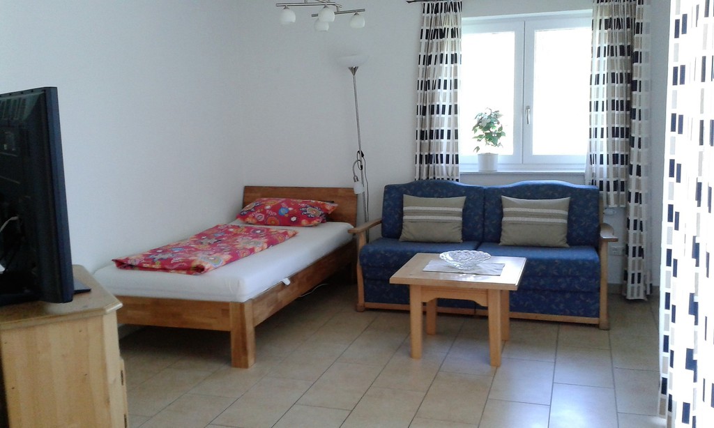 Das Wohnzimmer ist mit einer gemütlichen Schlafcouch ausgestattet, welche Platz für 2 weitere Besucher bietet. Ein Einzelbett (90cm x190cm) ist außerdem hinter dem Vorhang versteckt, welches auch als Ablagefläche benutzt werden kann. Selbstverständlich finden Sie hier auch einen SAT-TV und Radio für entspannte Stunden auf dem Sofa.